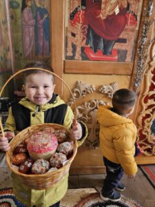 5 мая 2024 года. Поздравляем со Светлым Христовым Воскресением! Сегодня о. Артемий Фоминых в храме св. пророка Захарии совершил освящение пасхальных куличей, творожных пасок и яиц.